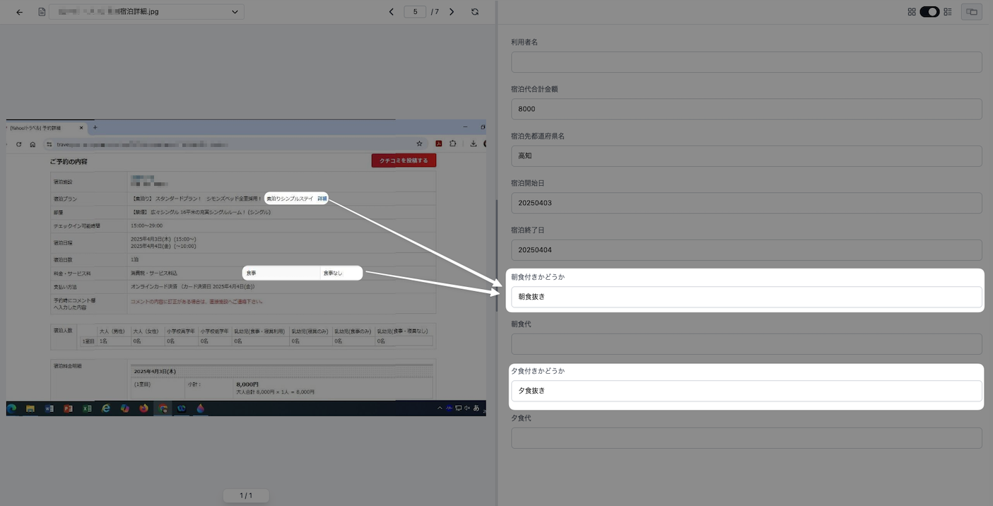 さらに出張時の宿泊旅費の精算では、朝食代が宿泊料金に含まれているかを記載する必要がありますが、領収書や予約画面に「朝食付き」の明記がなくても、記載内容や周辺文脈から朝食の有無を推定することが可能です。項目の有無ではなく、内容を読んで判断している点が効いています。